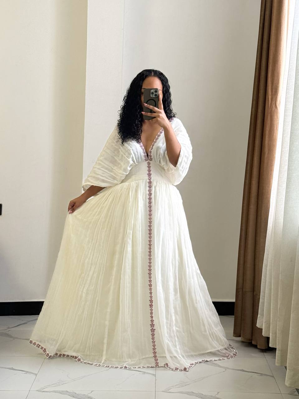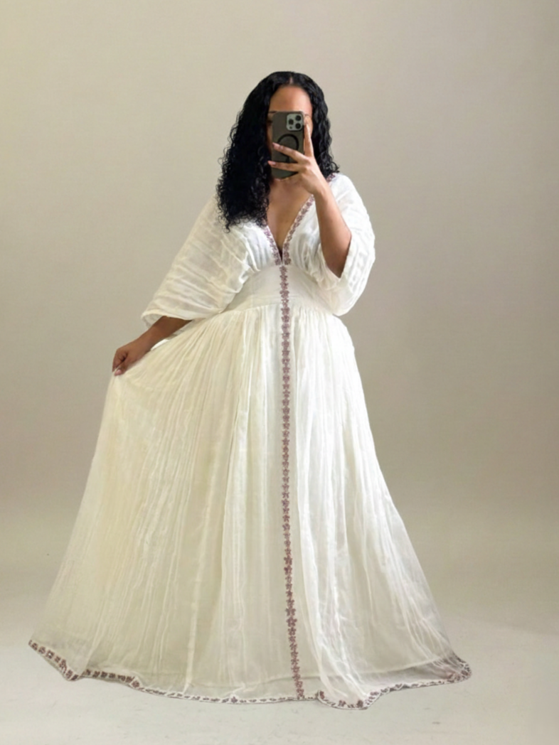Step into a world of grace with Aida’s Dress. This breathtaking Habesha Kemis is a celebration of classic Ethiopian beauty, named after the Amharic word that signifies help or reward, the perfect name for a gown that serves as a stunning reward for any special occasion.