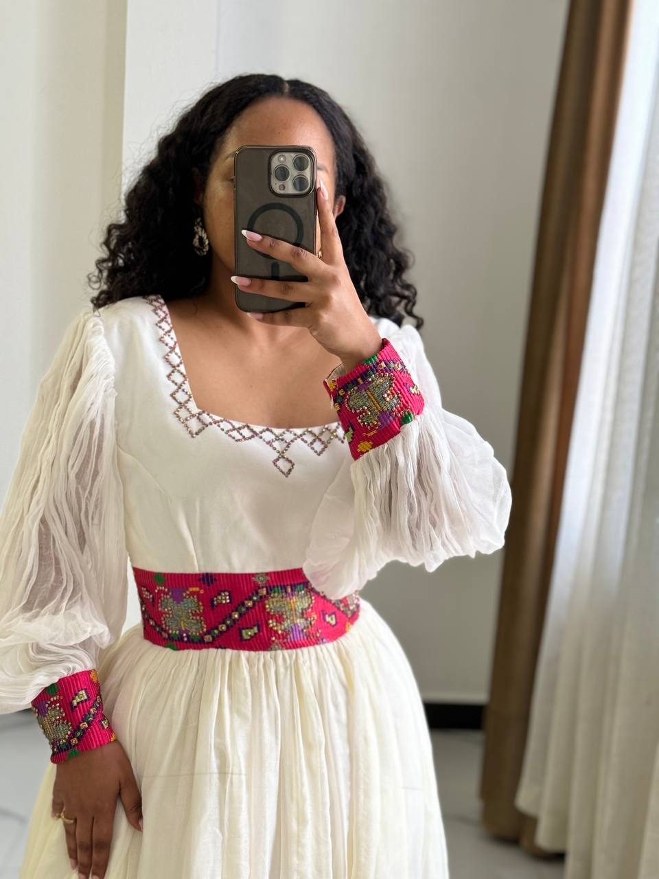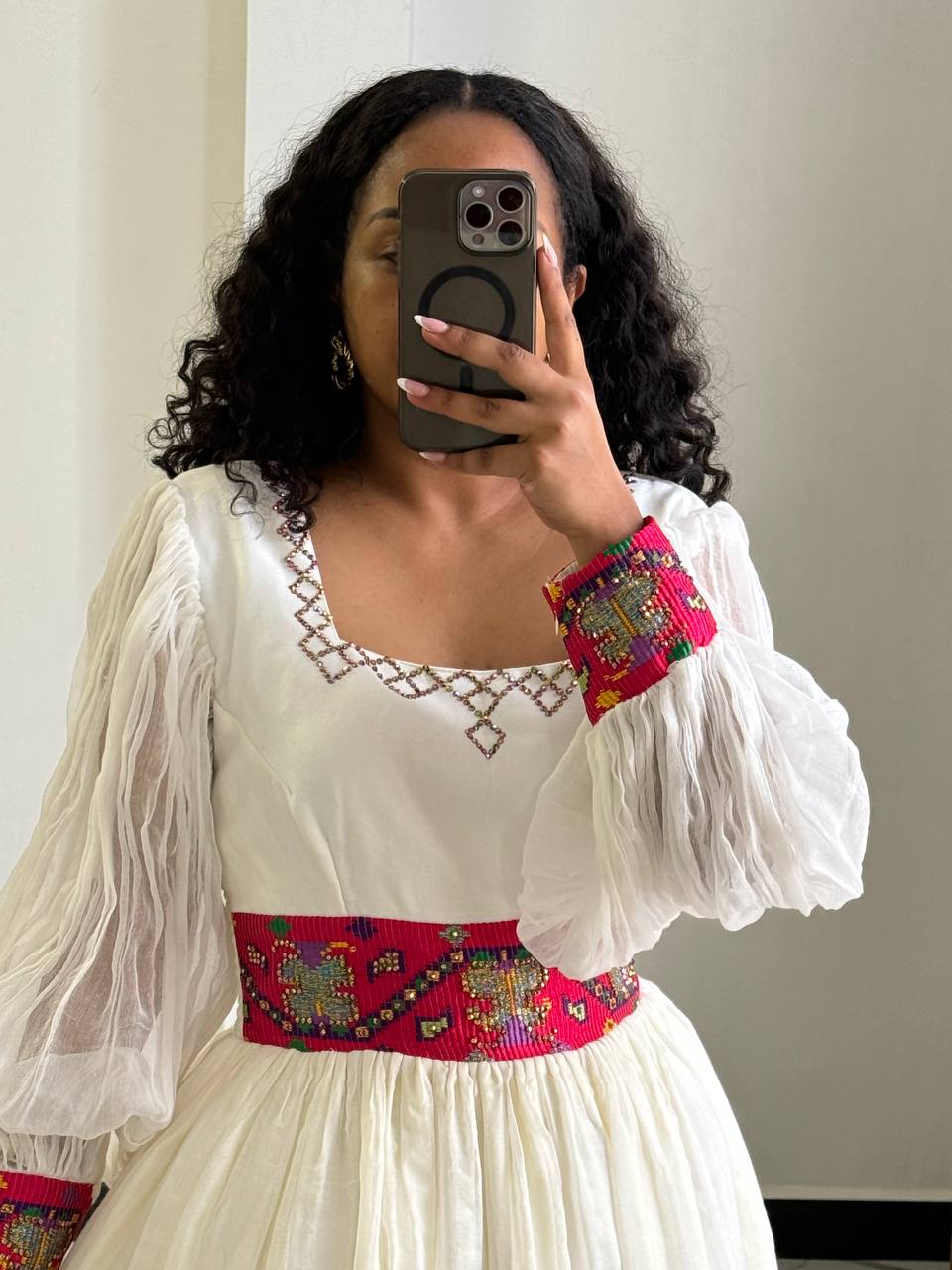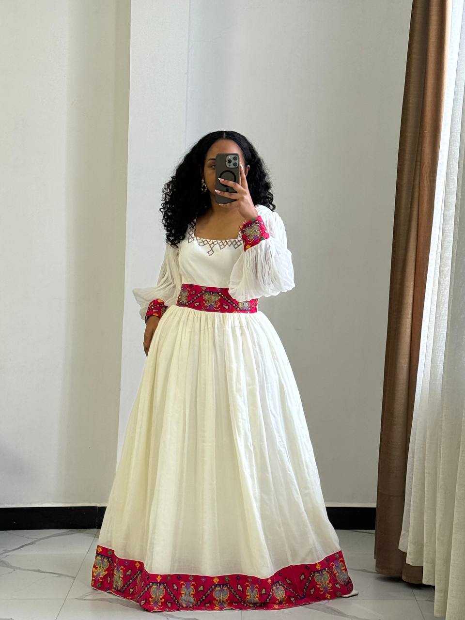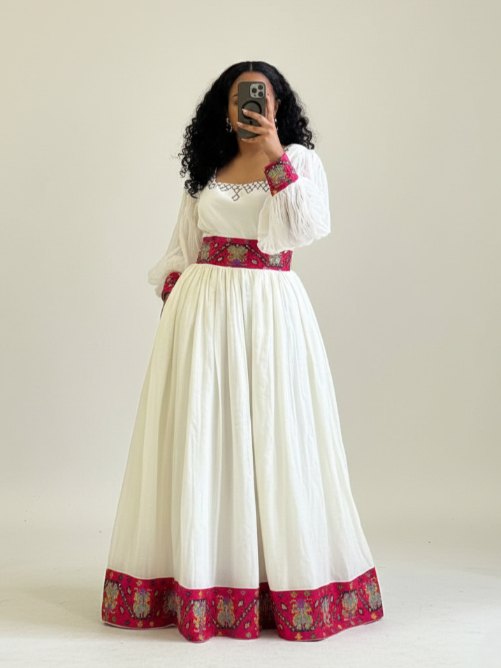 Celebrate the season of joy with Bilen’s Kemis, a breathtaking Habesha Kemis designed to bring light and elegance to your most cherished celebrations. Named after the Amharic word for “radiant” or “bright,” this gown is a stunning fusion of traditional soul and festive color.