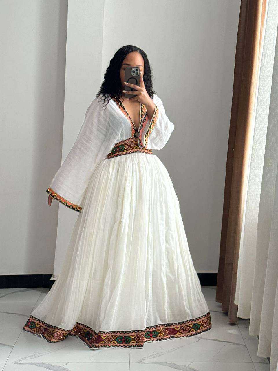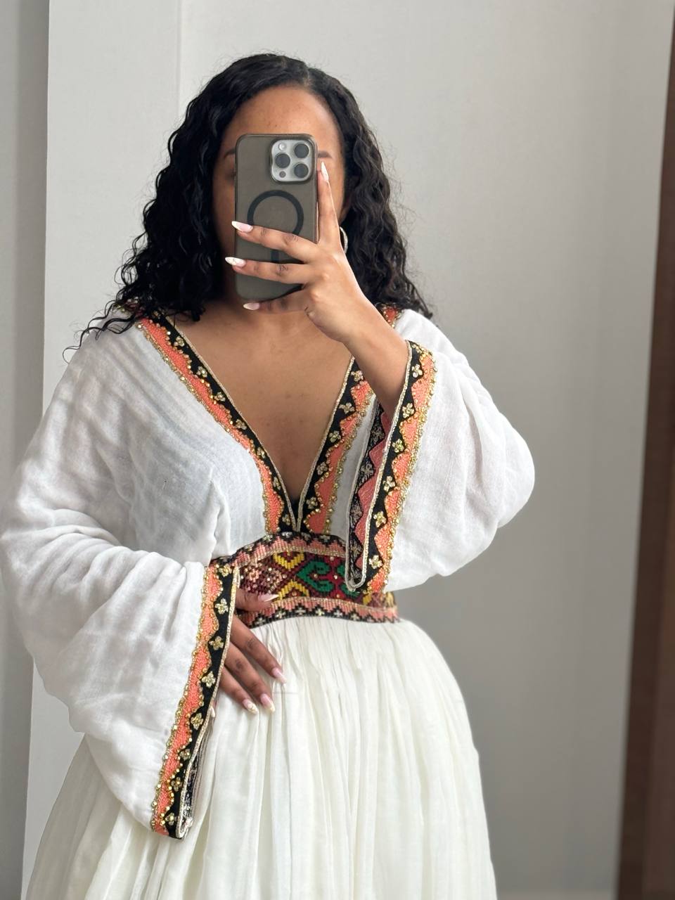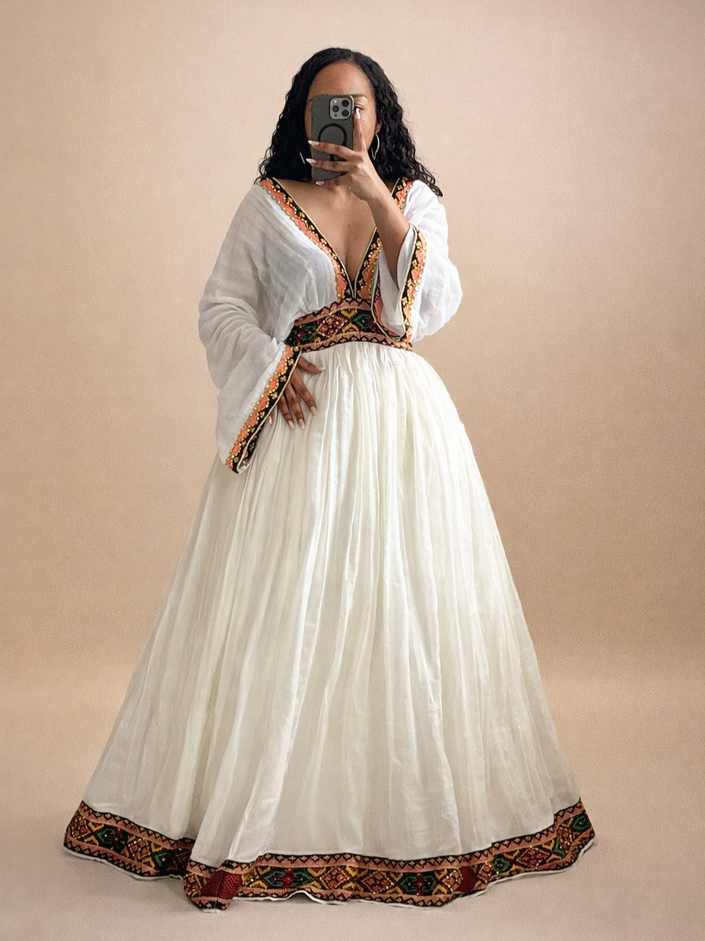 The Mahlet Flow Dress embodies elegance and tradition. Named after the Amharic word for “song” or “hymn,” this Habesha Kemis is a lyrical tribute to Ethiopian heritage, designed to move with the effortless beauty of a sacred chant.