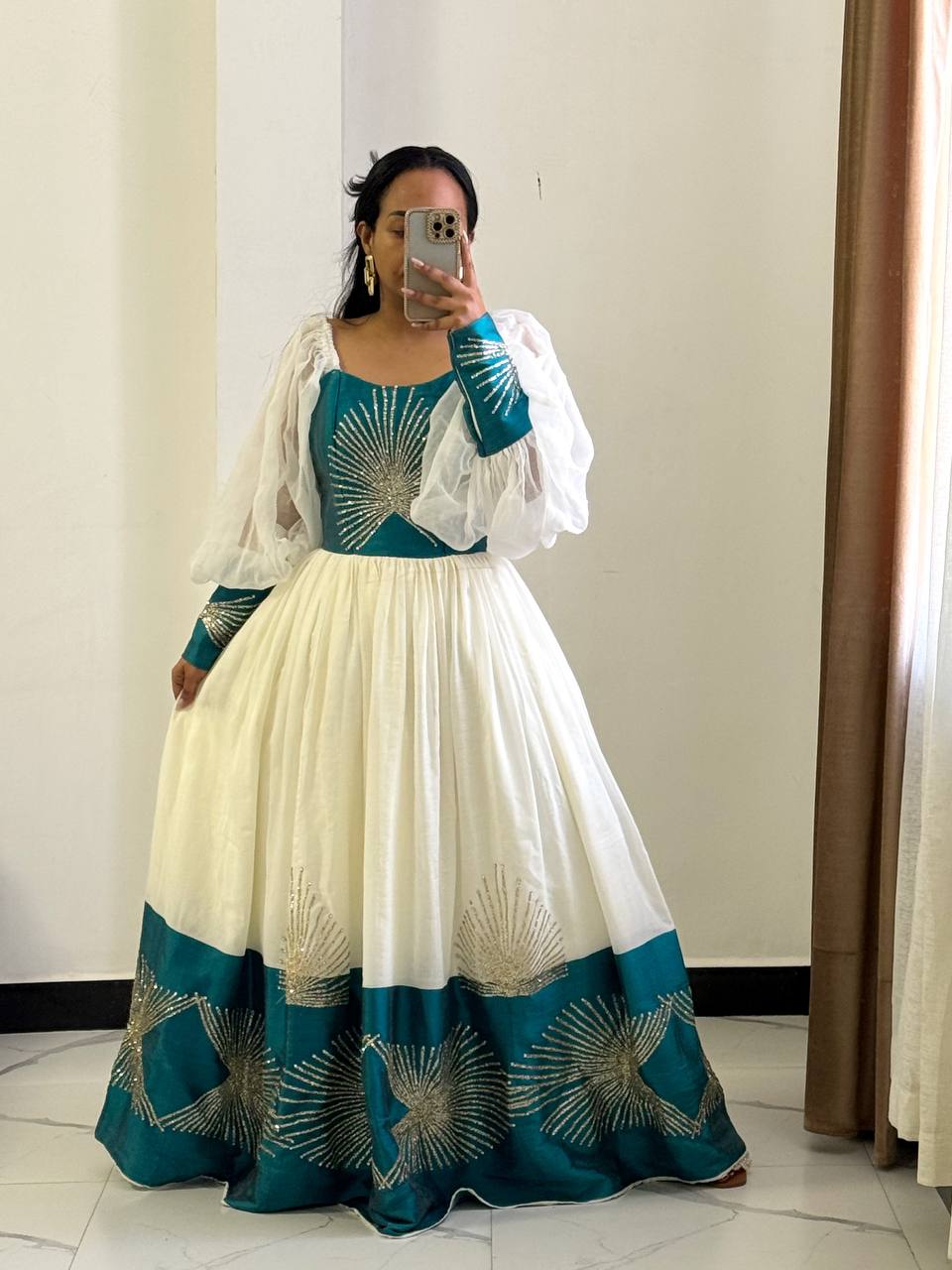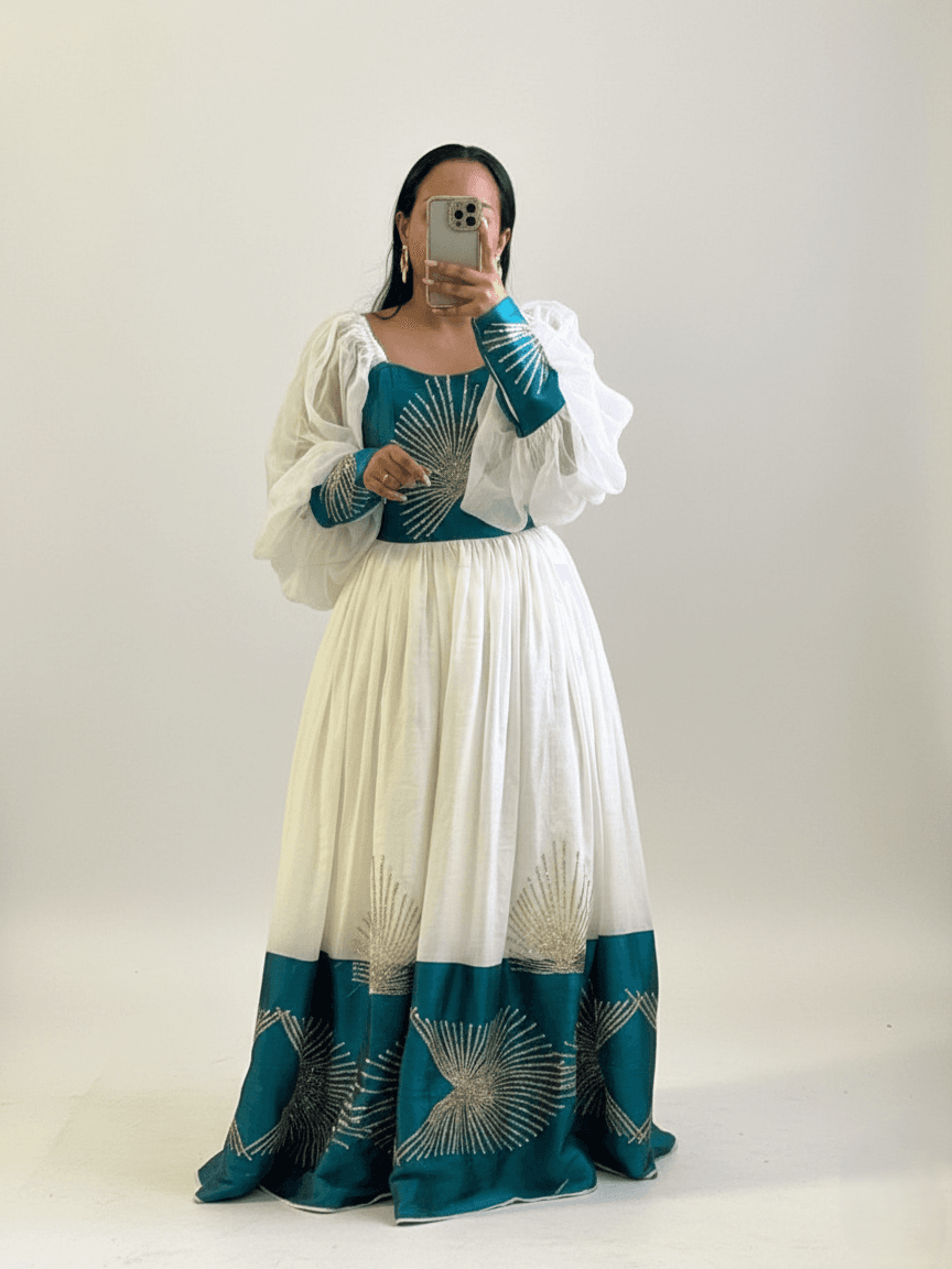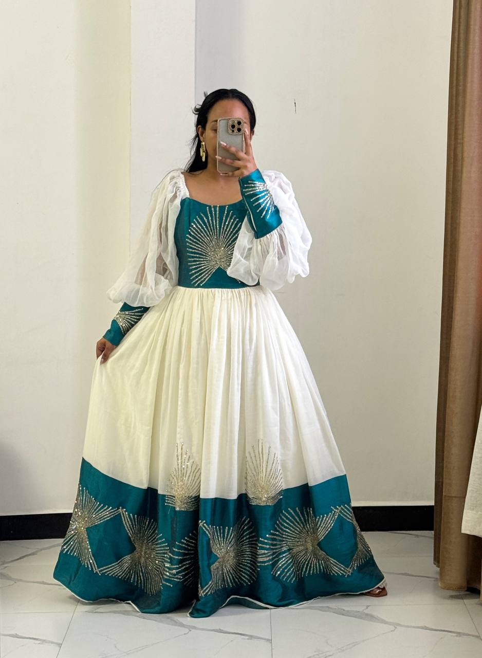 Floor-length Habesha Kemis featuring a classic full, flowing skirt that creates a regal silhouette. The gown stands out with its voluminous, sheer balloon sleeves made from delicate white chiffon, gathering elegantly at the wrists.