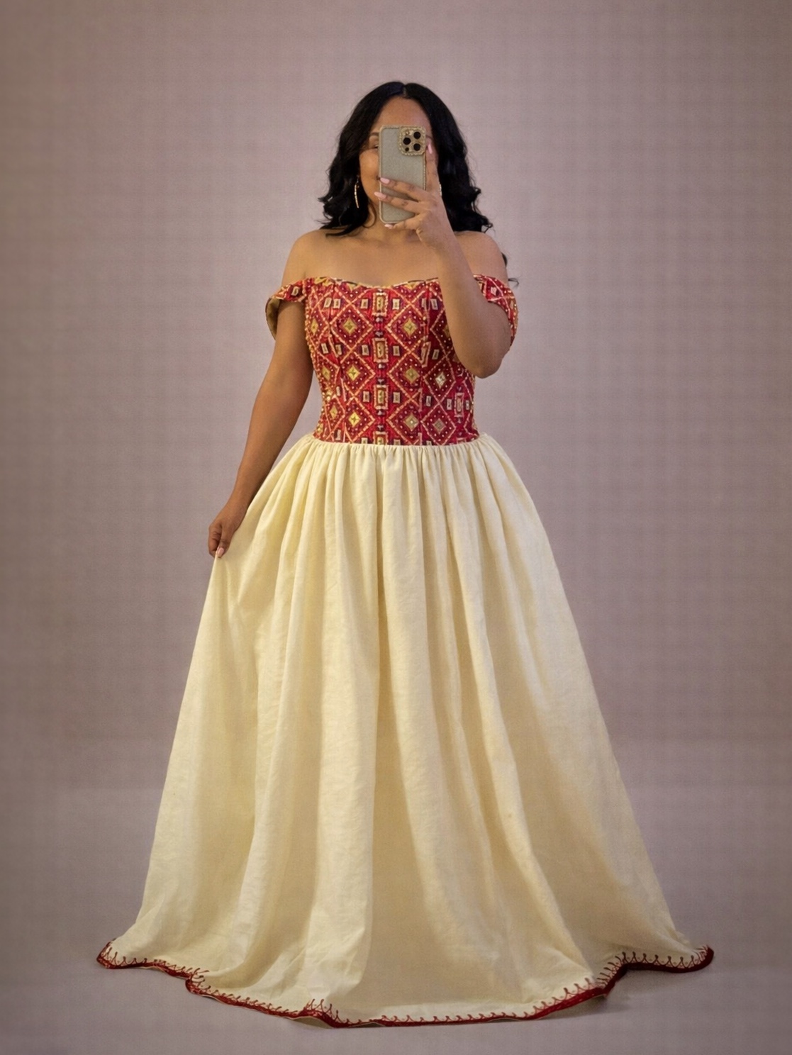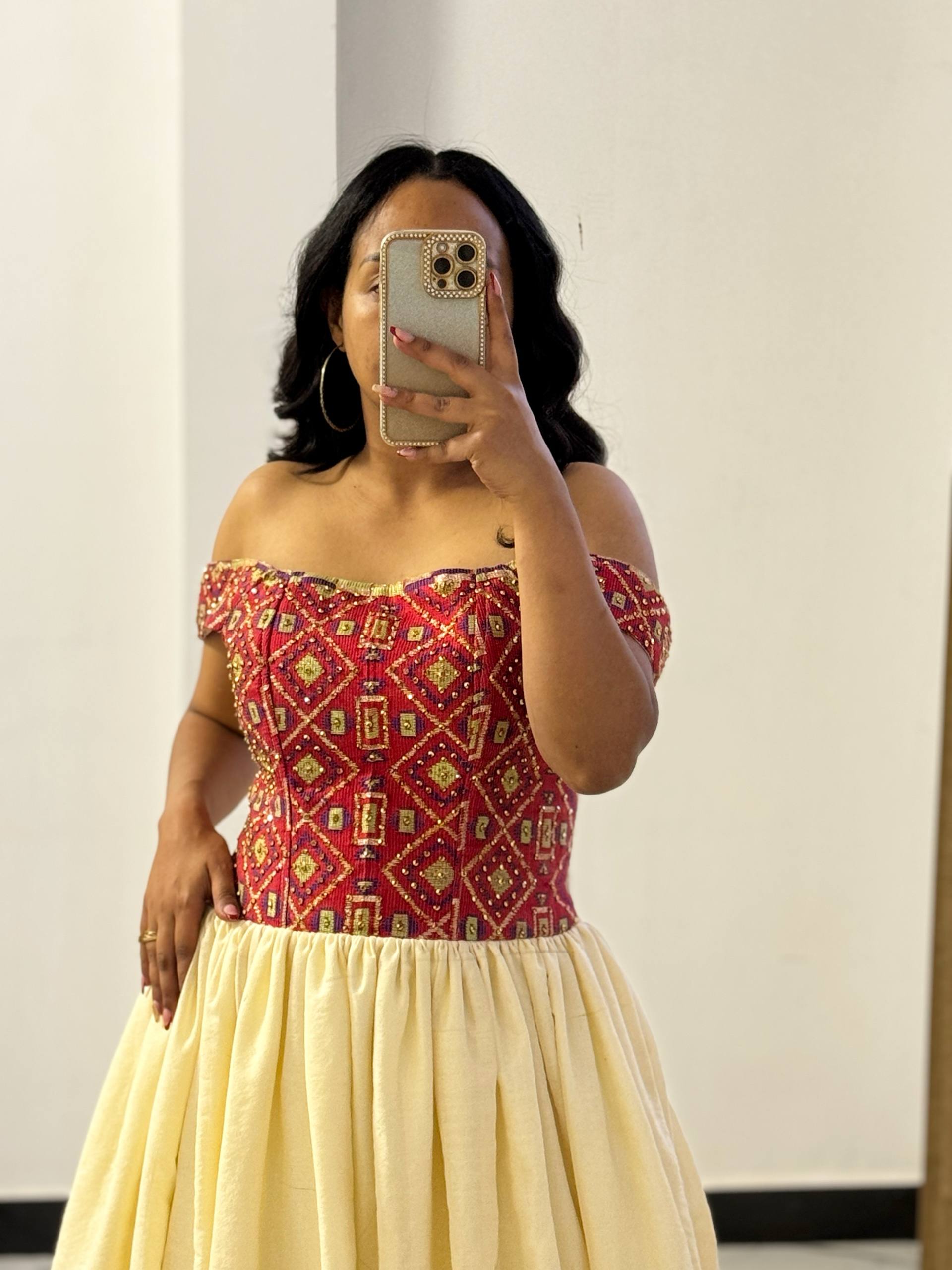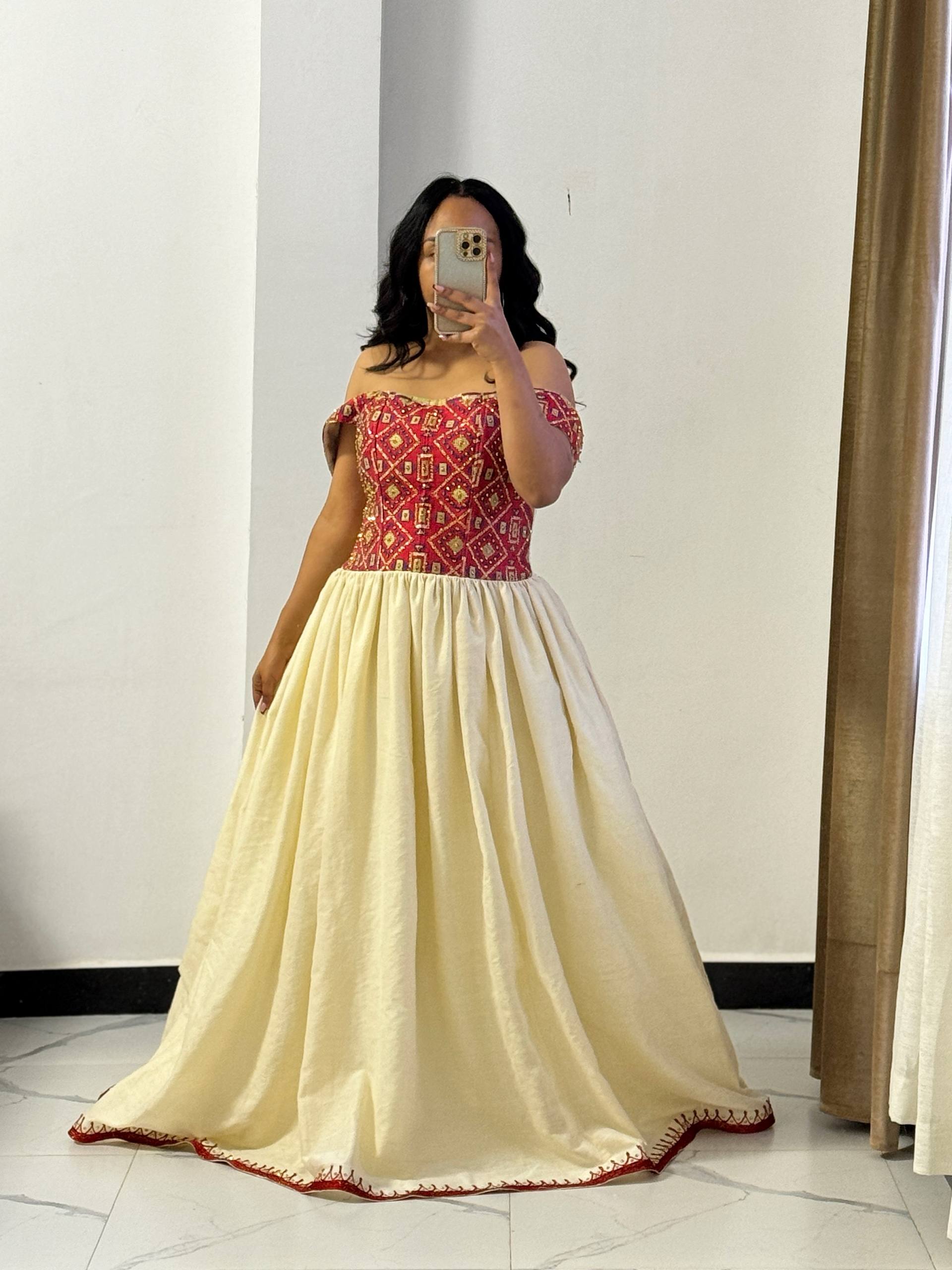 Every detail is carefully finished by skilled artisans in Ethiopia, ensuring that each Sehin Gown is a unique work of art. The regal gold-on-ivory palette and dramatic movement make the Sehin Gown an exceptional choice for weddings, Melse ceremonies, and Grand Holiday celebrations.