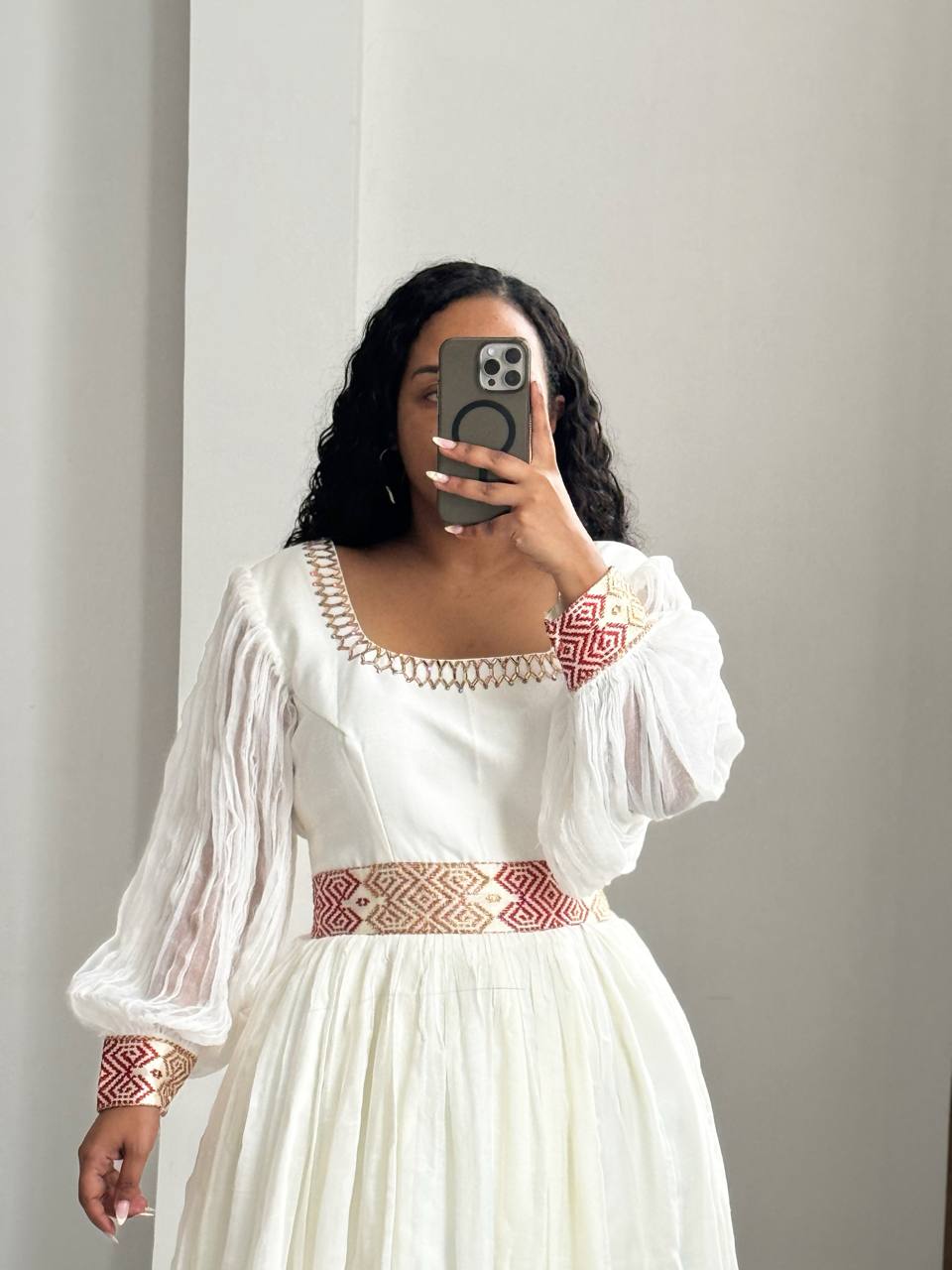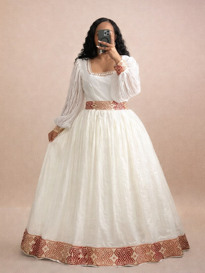 Illuminate your next celebration with Semhal’s Dress. This breathtaking Habesha Kemis is a tribute to eternal beauty, combining classic Ethiopian patterns with a bright, sophisticated palette that captures the light and the spirit of joy.