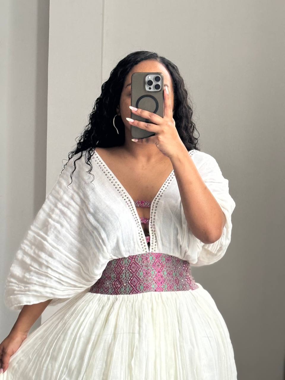 Embody the rhythm of tradition with the Zema Gown. Named after the ancient Ethiopian tradition of Zema (sacred chant or melody), this breathtaking Habesha Kemis is a masterpiece of Ethiopian craftsmanship, designed for the woman whose presence is as harmonious and soul-stirring as a beautiful song.